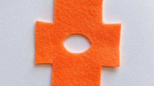 Für die Jacke nehmt ihr ein rechteckiges Stück Filz (einfach nach Augenmass) und faltet es in der Mitte aufeinander. Nun schneidet ihr rechts und links kleine Rechtecke ab und lasst die „Ärmel“ stehen. In der Mitte schneidet ihr nun einen Halsausschnitt hinein.