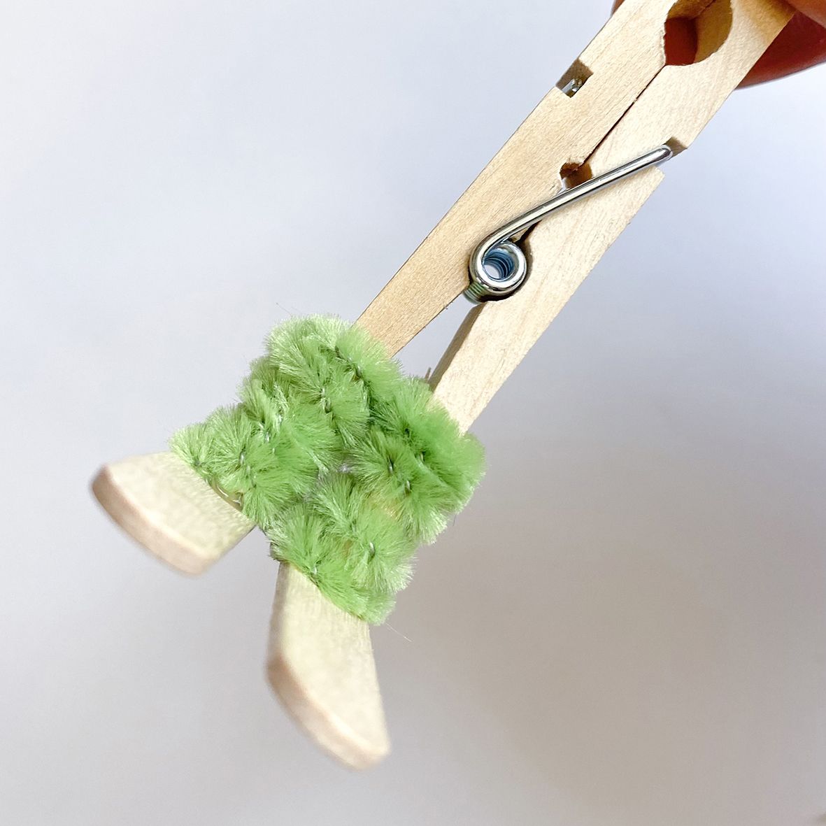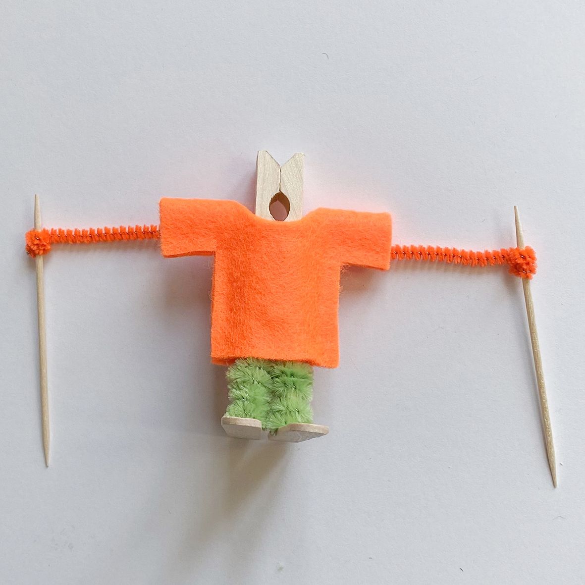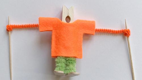 Für die Hose wickelt ihr den Pfeifenreiniger jeweils separat um die «Griffe» der Wäscheklammer und zwickt das Ende mit der Zange ab. Nun gebt ihr Heissleim auf die „Füsse“ und klebt diese an den Skiern (den Bastelhölzern) fest.
