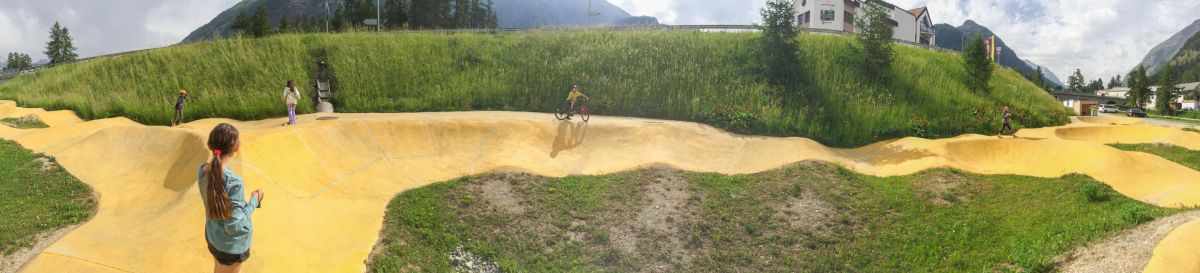Man kann den Pumptrack immer besuchen, ausser im Winter, weil es hier im Engadin sehr viel Schnee hat. Es gibt keine Altersbeschränkung.