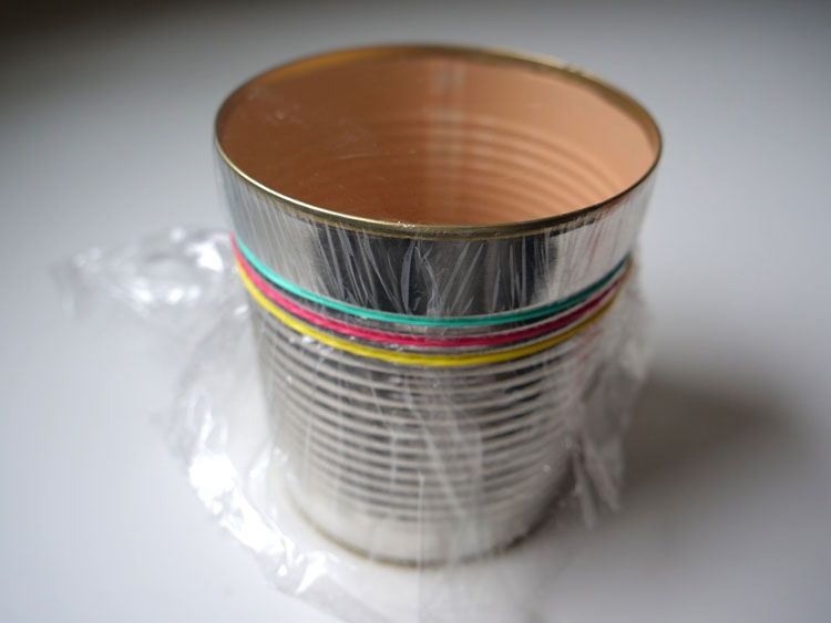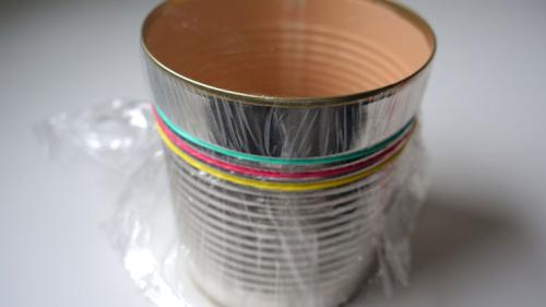3. Lege ein Stück Frischhaltefolie auf die Dose und spanne es mit Gummis fest auf den Dosenrand.