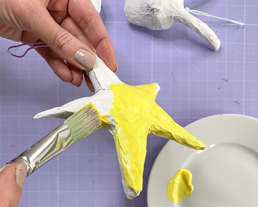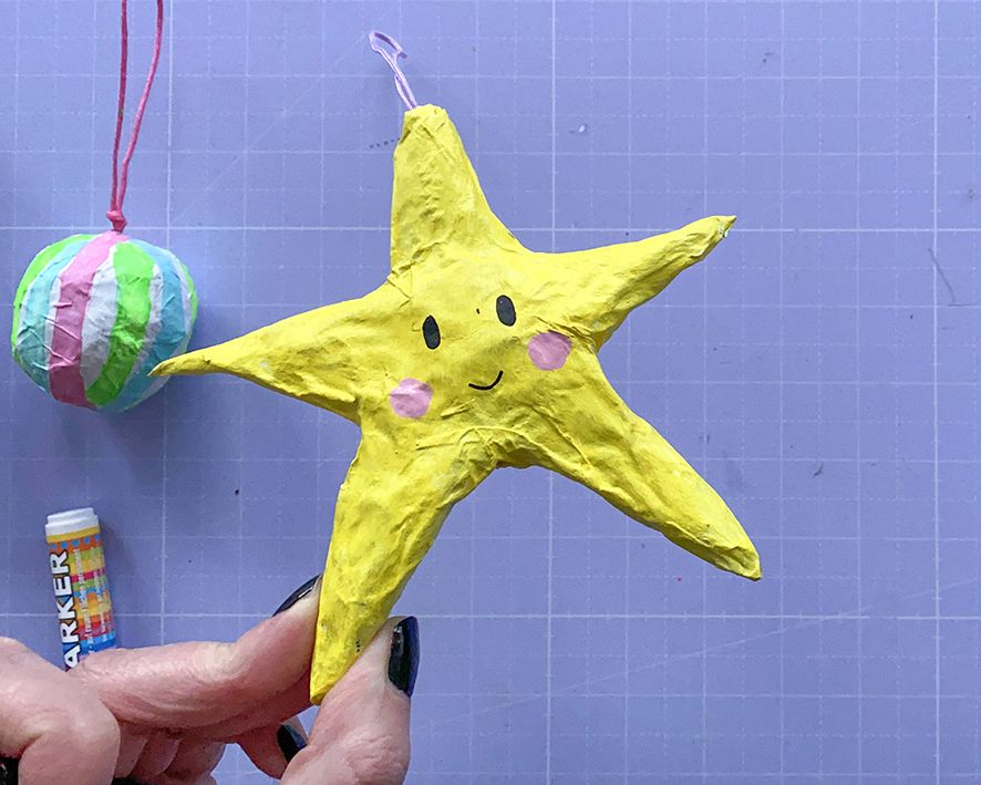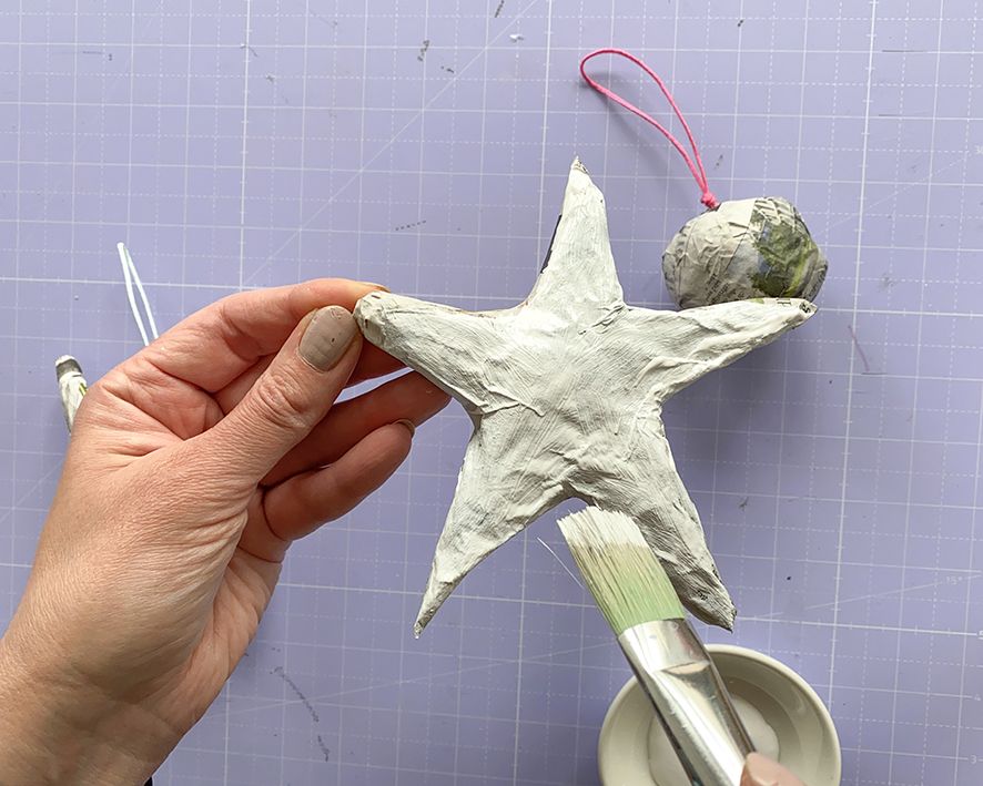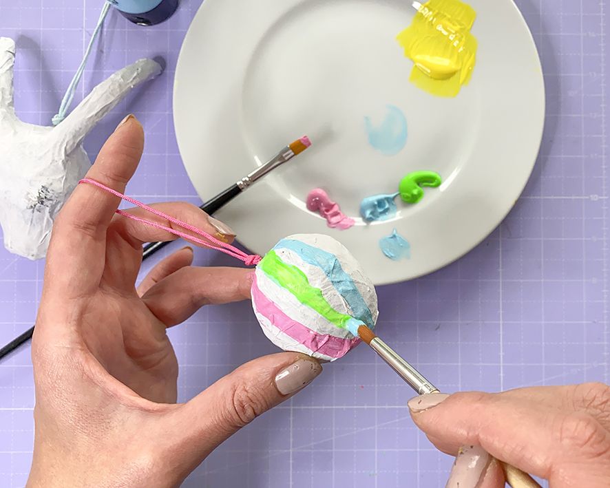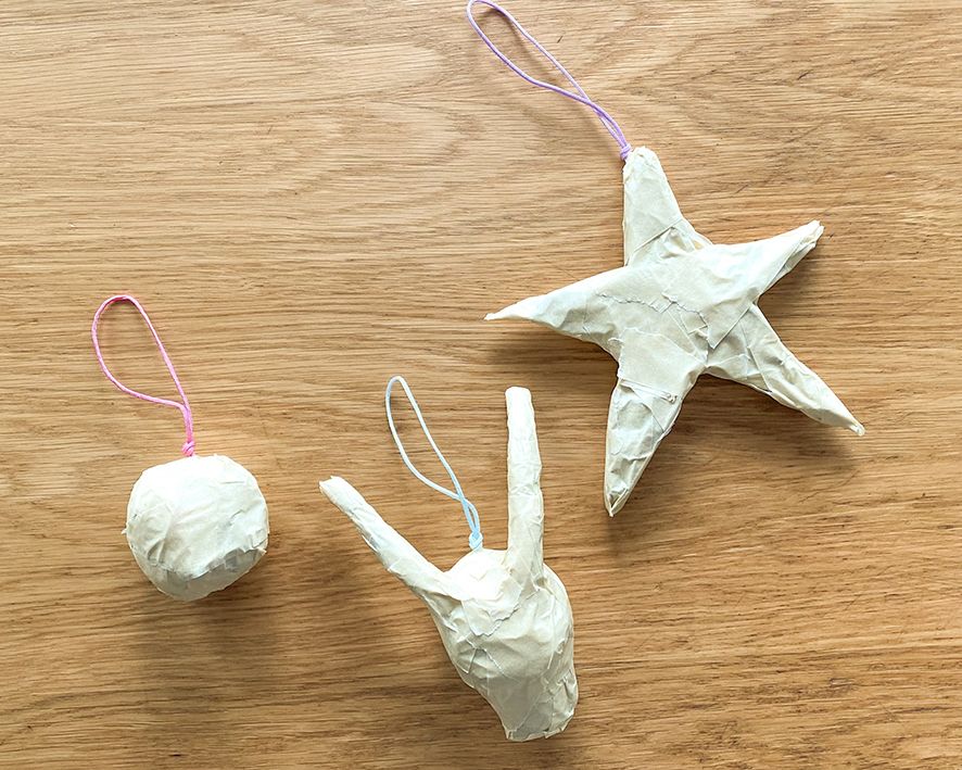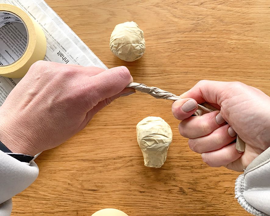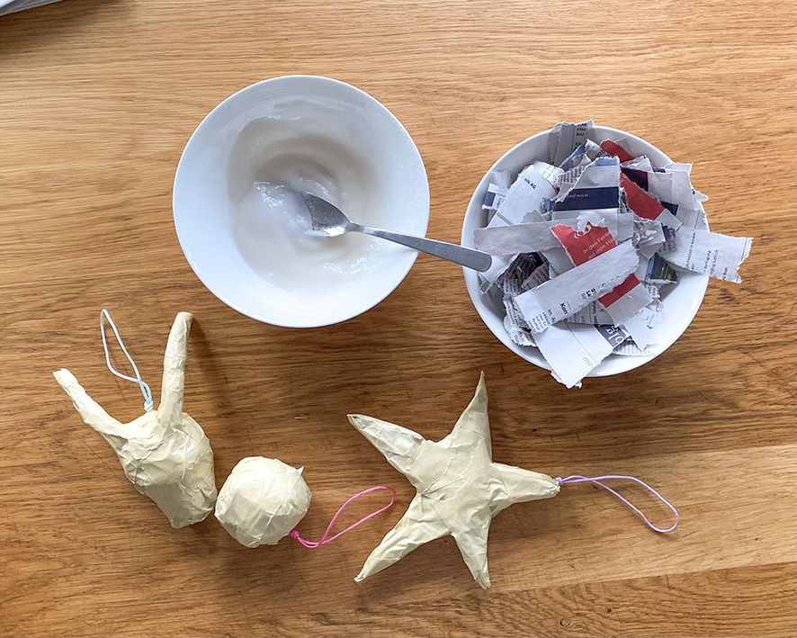 Hierfür braucht ihr nur etwas Papier (z.B. Füllmaterial aus Paketen, alte Zeitungen, etc.), Malerkrepp, Fischkleister, Acrylfarbe und einen Nylonfaden als Aufhänger.
