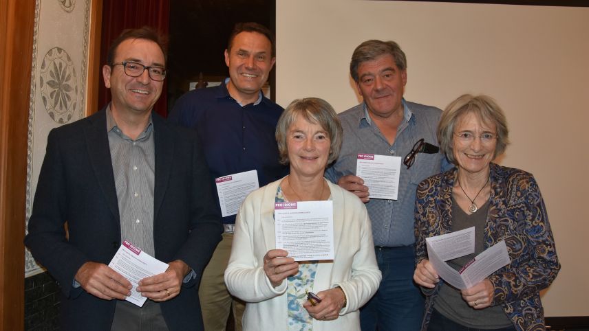 Han cumbattü ils ultims ons pels böts da la Pro Idioms. Da schnestra: Gian Nicolay, Domenic Toutsch, Anna Chatrina Brunold, Armon Parolini e Chatrina Urech (fotografia: Nicolo Bass).