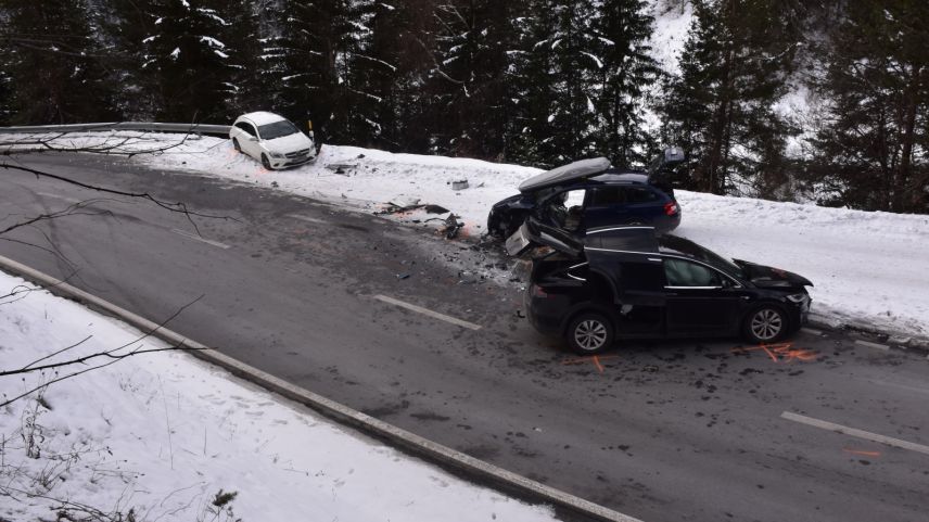 Ein 40-jähriger Schweizer fuhr am Samstag, 21. Januar, um 09.15 Uhr mit seinem Personenwagen auf der Engadinerstrasse H27 von Scuol in Richtung Ardez. In einer Rechtskurve geriet sein Auto gemäss ersten Erkenntnissen auf die Gegenfahrspur und kollidierte seitlich mit einem Auto aus der Gegenrichtung, gelenkt von einem 43-jährigen Slowaken. Dem Auto des Slowaken wurde bei der Kollision hinten links die Türe und das Rad abgerissen. Vor einem Abhang kam das Auto auf der Leitplanke zum Stillstand. Hinter dem Slowaken fuhr ein weiteres Auto, gelenkt von einem 62-jährigen Polen, mit welchem das Auto des Schweizers frontal-seitlich kollidierte. Gemäss Medienmitteilung der Kantonspolizei Graubünden führte ein Team vom Rettungsdienst Scuol bei den Unfallbeteiligten vor Ort medizinische Kontrollen durch und transportierte den Polen sowie seine Mitfahrerin zur ambulanten Behandlung ins Spital. Die total beschädigten Autos wurden aufgeladen und abtransportiert. Die Kantonspolizei Graubünden klärt den genauen Unfallhergang ab.