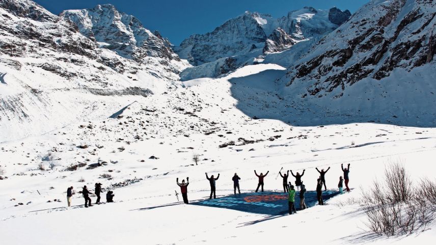 Mit dieser Blache zeigen die Umweltschützer, wo die mögliche Staumauer in der Val Roseg zu stehen kommen könnte. Fotos: Stefanie Wick Widmer
