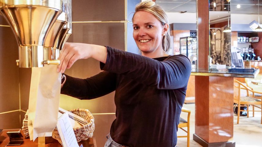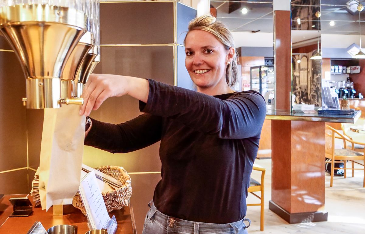 Geschäftsführerin Sabina Cloesters füllt bei der Erlebnisinsel Kaffeebohnen ab. Foto: Jon Duschletta