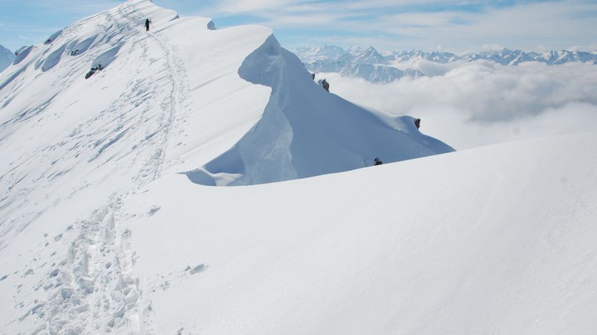 Skitourengeher und eine eindrückliche Schneewechte am 2808 Meter hohen Monsteiner Büelenhorn zwischen Davos Monstein und Bergün. Foto: Marcia Phillips/SLF