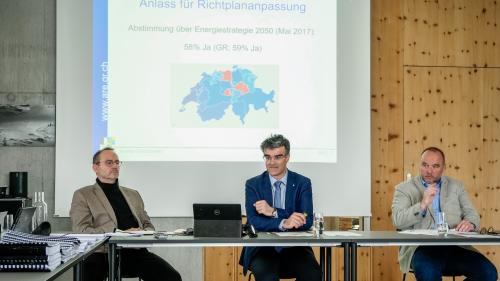 Jede Form der Energiegewinnung habe letztlich ihren Preis, argumentierte Volkswirtschaftsdirektor Caduff und ergänzte: «Die Produktionsanlagen stehen irgendwo in der Natur, weshalb wir eine Interessensabwägung zwischen Schutz und Nutzen vorzu­nehmen haben.» Eine solche sei mit dem Richtplan auf technischer Ebene durchgeführt worden, «jetzt folgt mit der öffentlichen Vernehmlassung die politische und gesellschaftliche Abwägung». Das Amt für Raumentwicklung (ARE) und damit auch Raumplanungsbelange sind im Departement für Volkswirtschaft und Soziales unter Marcus Caduff angesiedelt.