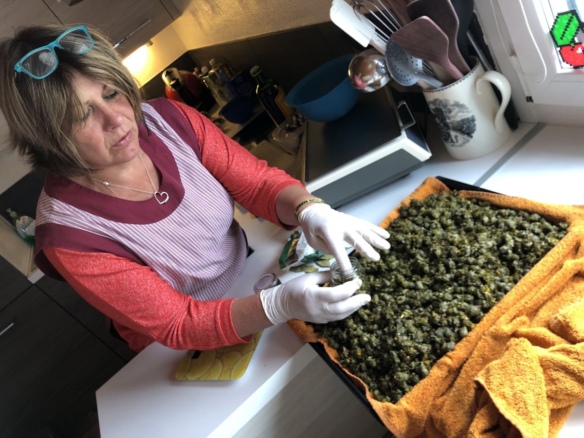 Durietta Buzzetti-Salis beim Abfüllen ihrer Löwenzahnknospen in die Einmachgläser. Foto: Marie-Claire Jur