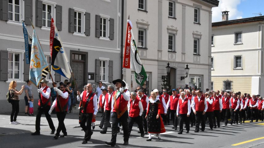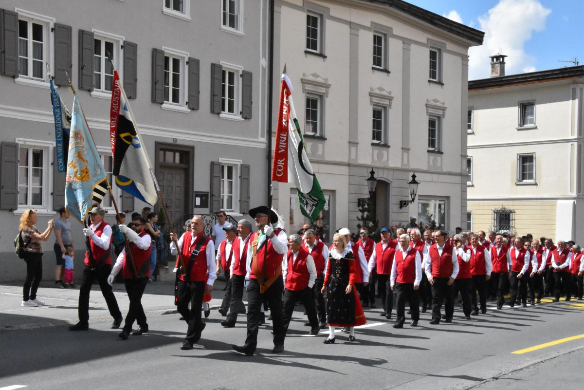 Die Società da musica Zernez führte den Umzug zum Schweizerischen Nationalparkzentrum an, wo sie ein Ständchen hielt. Foto: Bettina Gugger