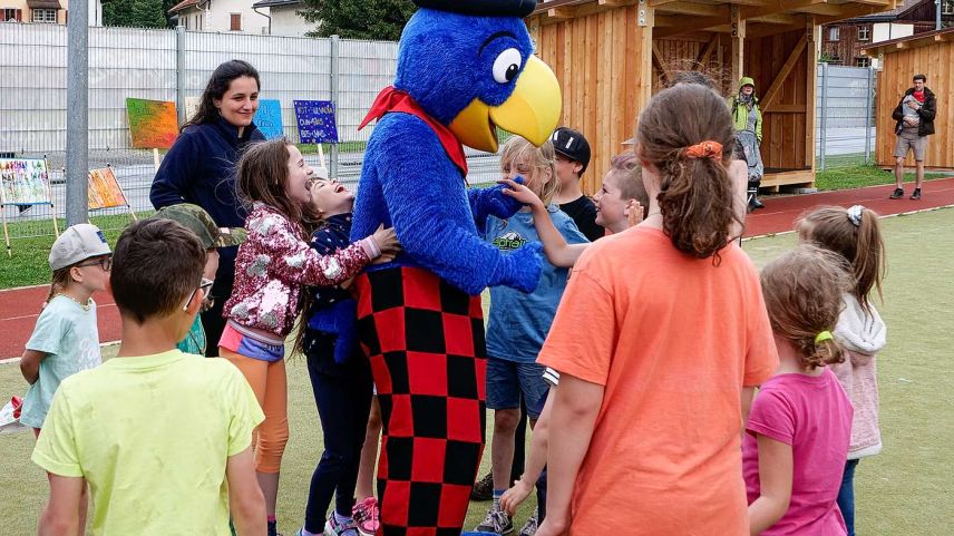 Globi ist von einem Pulk von Kindern umgeben, welche alle mit ihm ein Foto machen möchten. Das Maskottchen posiert freudig mit ihnen und hebt einen Jungen für einen coolen Schnappschuss hoch. Einzig ein kurzer Regenschauer führt dazu, ...