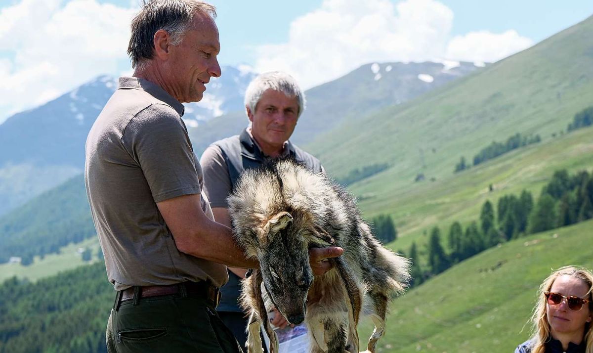 Thomas Wehrli zeigt den Teilnehmenden das Fell eines Wolfes, im Hintergrund Gianni Largiadèr. Foto: Jon Duschletta