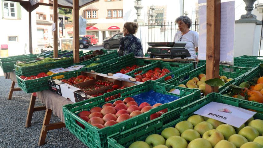 Sper divers prodots, specialiteds e regalins, vain eir spüerta verdüra e frütta al marcho eivnil da Samedan (fotografia: Martin Camichel).