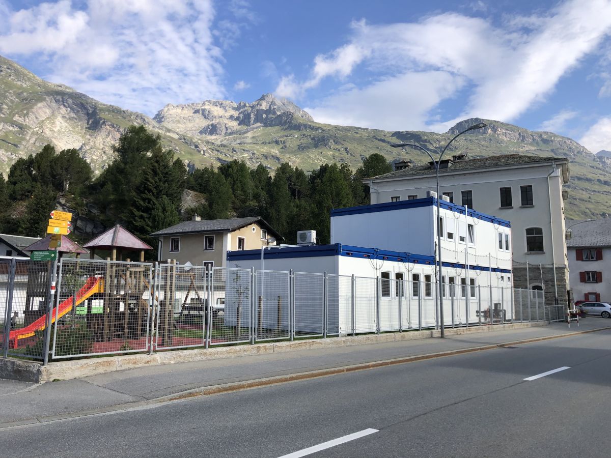 Die Primarschule von Maloja wächst so sehr, dass 13 der insgesamt 35 Kinder aktuell in Containern unterrichtet werden: Ein praktisches Provisorium, bis dereinst das neue Schulhaus steht.