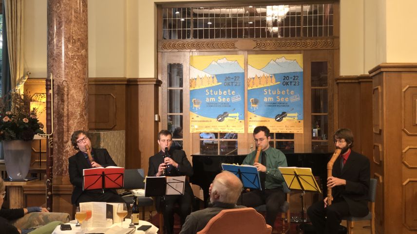 Eines der Ensembles, die an der Silser Stubete das Publikum verzückten: Die Flötenorgel bei ihrem Auftritt im Hotel Waldhaus. Foto: Marie-Claire Jur