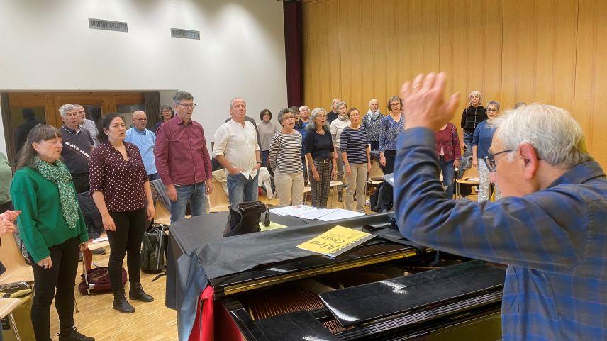 Il dirigent Jachen Janett ed üna part dal cor pro la penultima prouva in sonda passada a Sent (la terza da schnestra es la solista Sara Bigna Janett, la figlia dal dirigent). (fotografia: Flurin Andry)