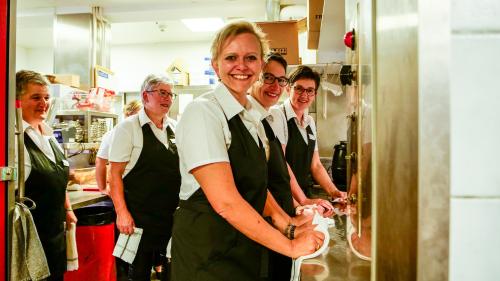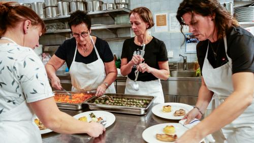 «... 71, 72, 73!» Zum zweiten Mal schon zählen zwei Milchbäuerinnen die weissen Gedecke im dezent beleuchteten Speisesaal vom Hotel Waldhaus am See durch. Jetzt endlich stimmt alles. Derweil begrüssen die Rezeptionistin und zwei Bäuerinnen die ankommende Gäste, zwei andere stehen hinter der Bar und servieren erste Getränke, wieder andere hantieren in der Hotelküche und bereiten dort Apéro und das Drei-Gänge-Menü vor.
