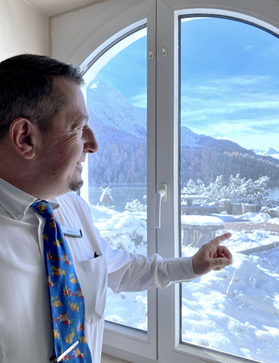 Im Waldhaus am See steht derweil das Abendessen an. Alberto Ciaponi fährt wieder hinauf auf Etage vier und holt eines seiner zehn weissen Hemden und eine Krawatte aus dem Holzschrank. Und voilà: Kurz darauf ist er im Speisesaal in seinem Element. Er kümmert sich freundlich und dezent um jeden Gast, wahrscheinlich auch um seine Zimmernachbarn. Zum Hauptgang gibt es Saltimbocca alla romana, Alberto empfiehlt dazu einen rubinroten Primitivo. Im Hintergrund leuchtet der St. Moritzersee im Mondlicht.