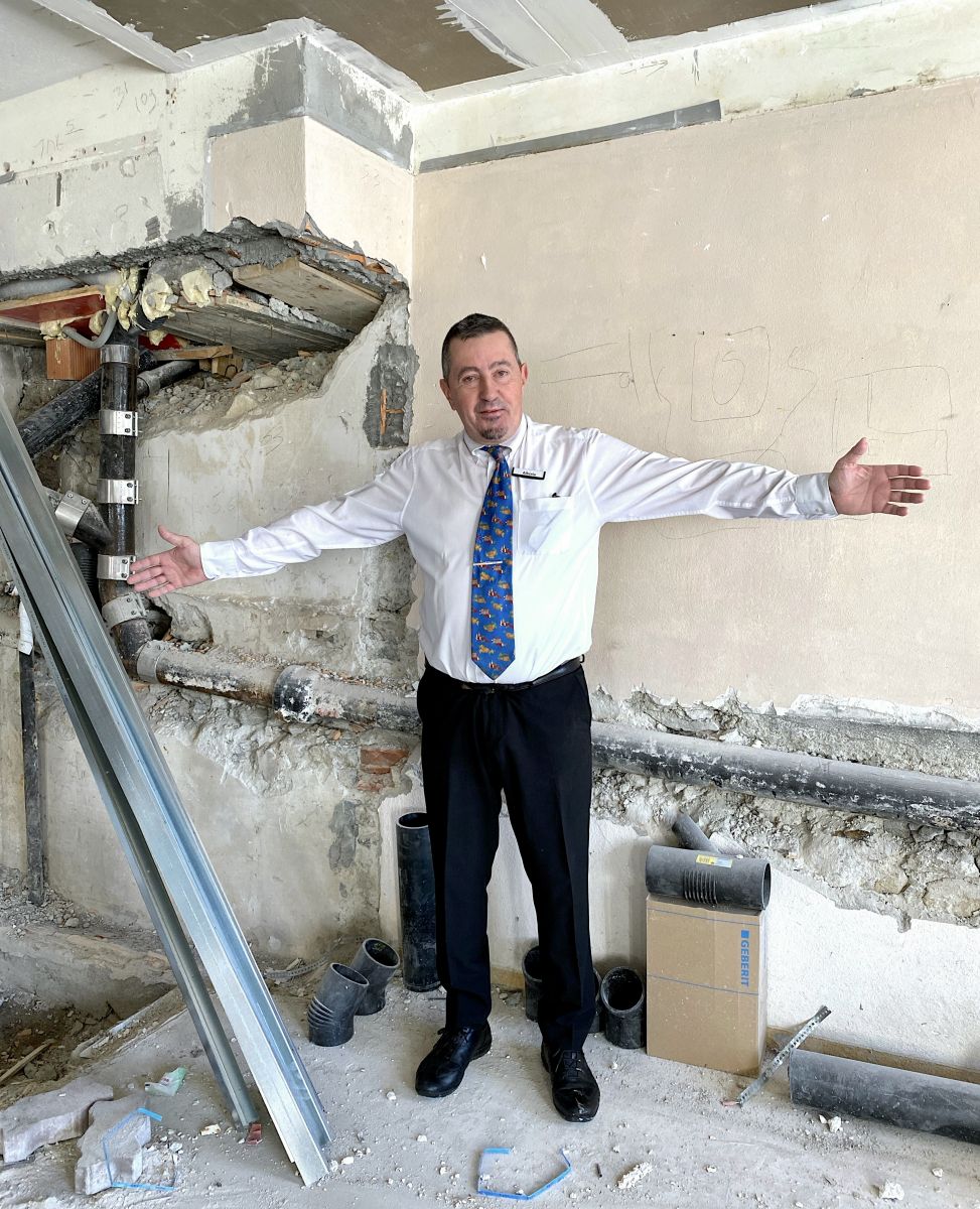 In einer Pause fährt Alberto mit dem Aufzug hinunter auf Ebene «–2». Neugierig schaut er sich schon mal in seinem zukünftigen Reich um. Noch wird gebohrt, geschleppt und gehämmert. Sein Zimmer wird eines von zwölf sein, rund 20 Quadratmeter gross, inklusive eigenem Bad und Seeblick. «Bisher haben wir uns Etagenbäder geteilt», sagt Alberto. Der Boden ist betoniert, nach einem gemütlichen Rückzugsort sieht es noch nicht aus. Sichtbar ist dennoch, dass viel Schweiss und Herzblut in das 1,5-Millionen-Projekt fliesst. Die Bauarbeiter sind fleissig bei der Sache, auch an Samstagen. Nur ab und zu stehen sie vor dem Hoteleingang und rauchen eine Zigarette.