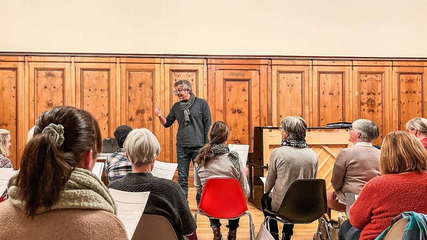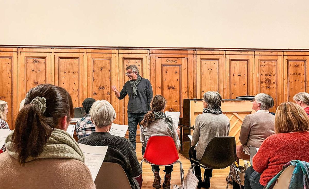 Der neue Cor masdo Puntraschigna Samedan steht unter der Leitung von Patrik Würms. Hier während einer Chorprobe zum Adventskonzert. Foto: Jon Duschletta