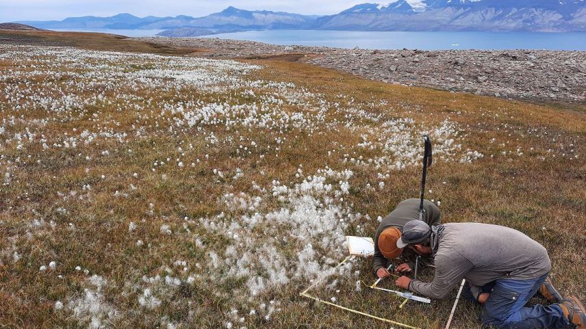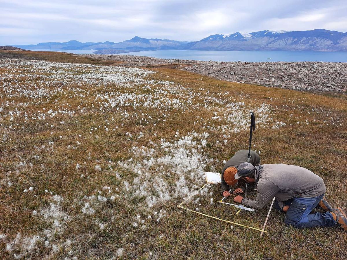 Charlotta Mattsson, Masterstudentin an der Uni Basel und Andreas Gygax, Autor der Flora Helvetica und Botaniker am SLF, untersuchen, wie sich die Pflanzenwelt auf Grönland in den vergangenen Jahrzehnten verändert hat. Foto: Christian Rixen/SLF