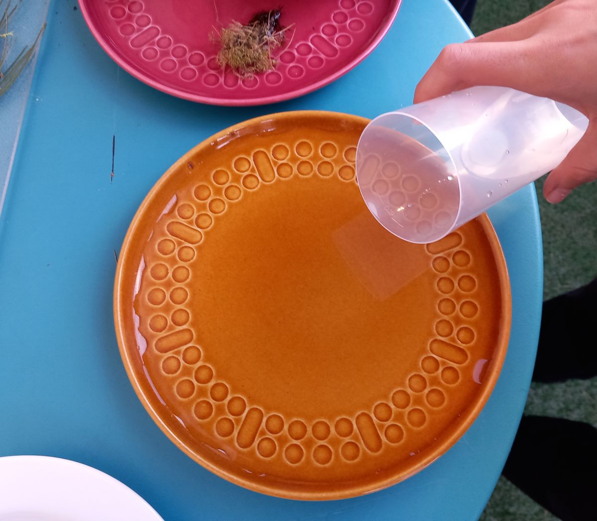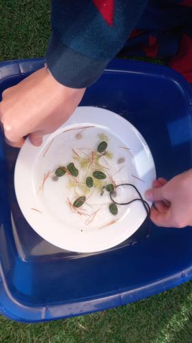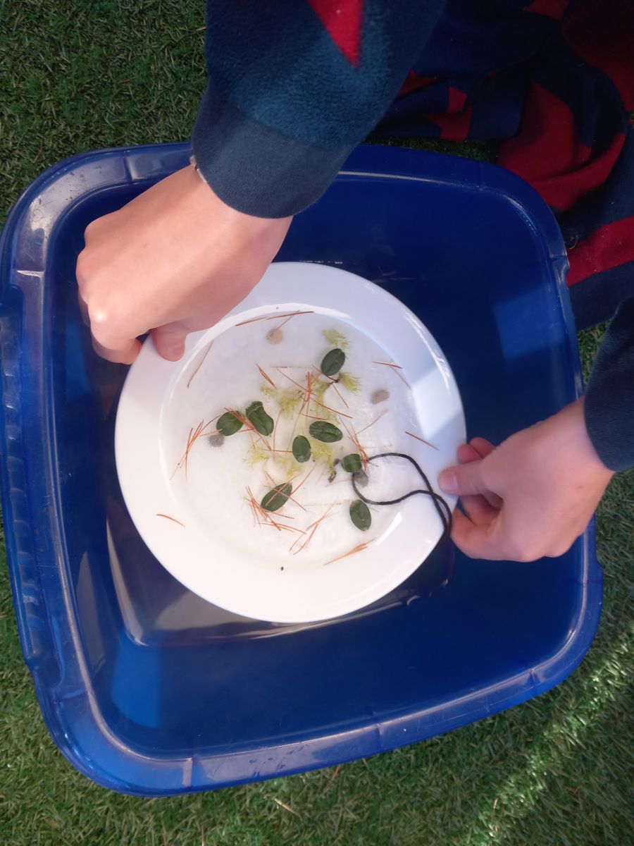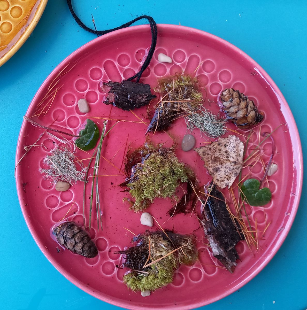 Als erstes sammelst du draussen Dinge, mit denen du dein Kunstwerk verzieren möchtests und nimmt einen Teller, den du mit Wasser füllst: