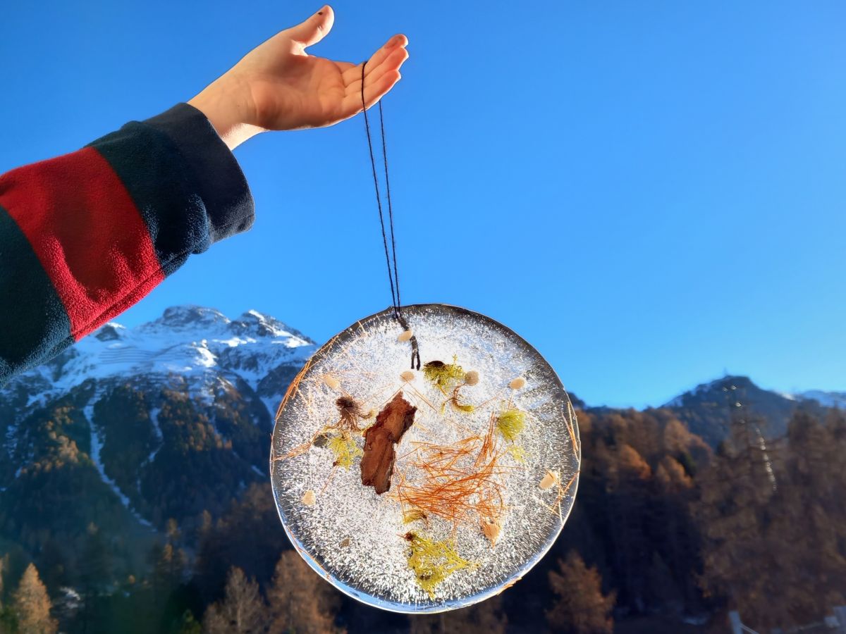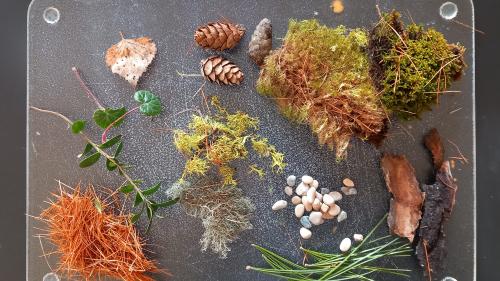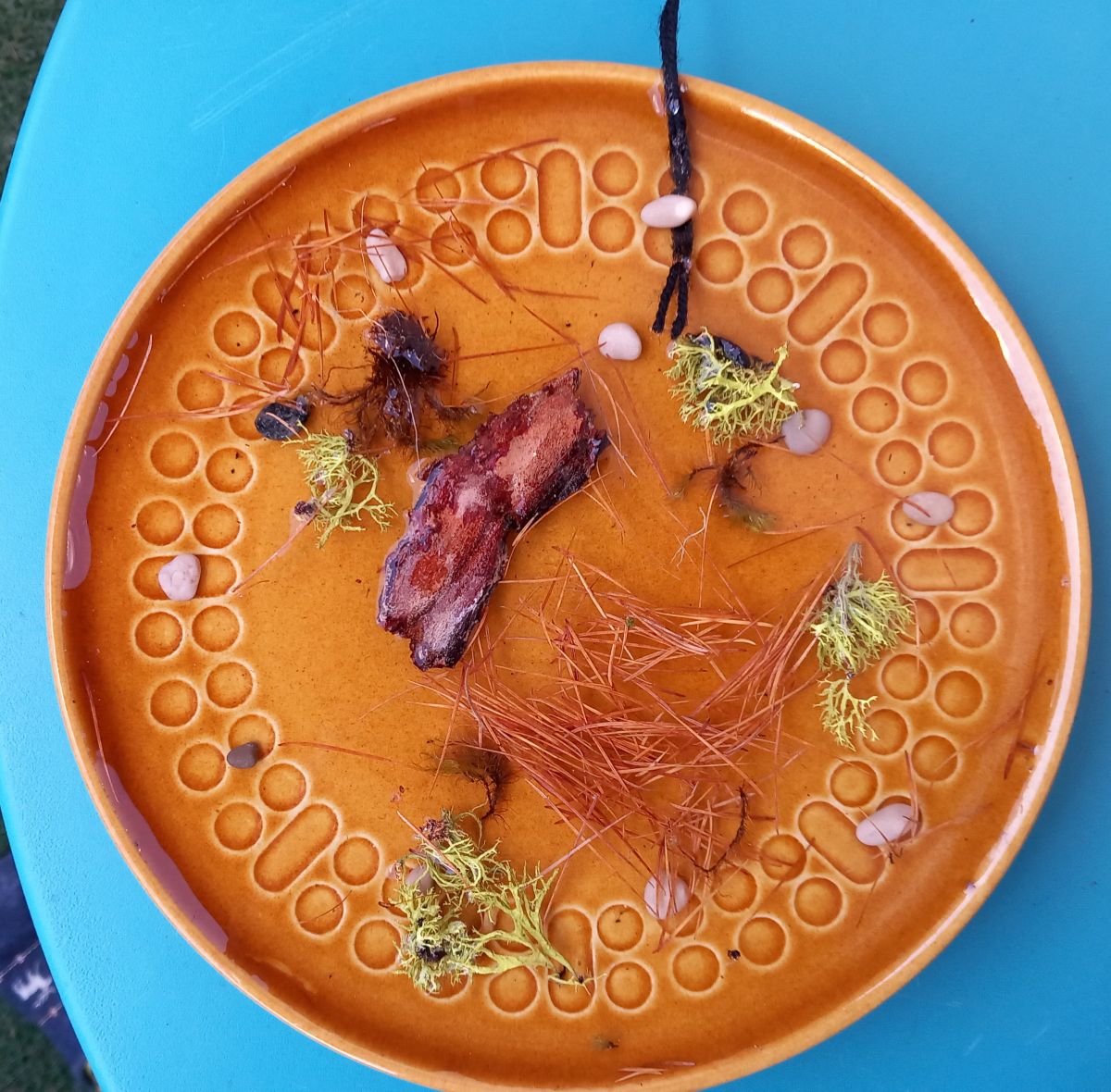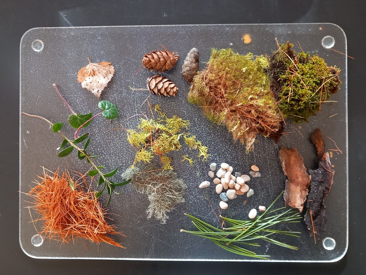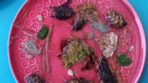Als erstes sammelst du draussen Dinge, mit denen du dein Kunstwerk verzieren möchtests und nimmt einen Teller, den du mit Wasser füllst:
