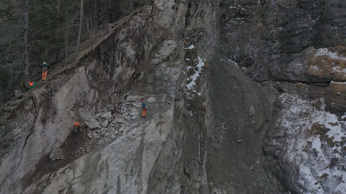 Mit Kletterseilen gesichert, entfernen Spezialisten das lose Felsmaterial. Foto: Armon Schlegel