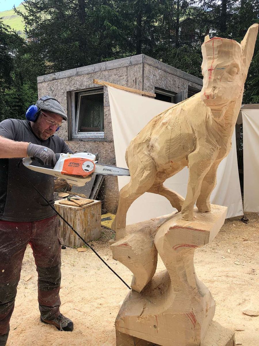 Nachwuchssorgen plagen Helmut Tschiderer aus Samnaun noch nicht, schliesslich steht er mitten im Leben und strotzt vor Tatendrang. Auch der Samnauner ist nicht gerade im ersten Anlauf zum Holzschnitzen gekommen. Wohl war das Interesse gross, aber auch die Furcht, davon nicht leben zu können. Deshalb absolvierte er eine Lehre als Koch, worauf ihn die Arbeit dann nach Samnaun führte. Nebst der Arbeit in der Küche schrieb er sich bei einem bekannten Lehrmeister zum Holzschnitzerlehrgang ein und bestand die Abschlussprüfung in Wien mit Bravour. Tschiderer arbeitet nicht nur mit Holz, sondern auch mit Metall. Bronzegiessen sei etwas vom Liebsten, das er mache, sagt er. Die Giesserei hat er sich der Einfachheit halber gleich zu Hause eingerichtet, sprich in seinem Atelier, dort befindet sich auch die Holzwerkstatt. Stechbeitel und ähnliche Schnitzwerkzeuge, wie sei bei Wallnöfer zu sehen sind, braucht er allerdings kaum mehr. Tschiderers Schnitzen ist eher ein Sägen. Sämtliche seiner Werke erschafft er mit Motorsägen in verschiedenen Grössen. Umso erstaunlicher, dass dies den Werken nicht anzusehen ist. Trotz der eher brachial scheinenden Methode wirken seine Skulpturen fast schon filigran. Und das Beste am Ganzen: Er gibt sein Wissen auch in Workshops weiter. Zwar eignet sich die Motorsägemethode nur bedingt als Arbeit an langen Winterabenden vor dem Cheminée, eindrücklich ist der Schaffensprozess aber allemal.