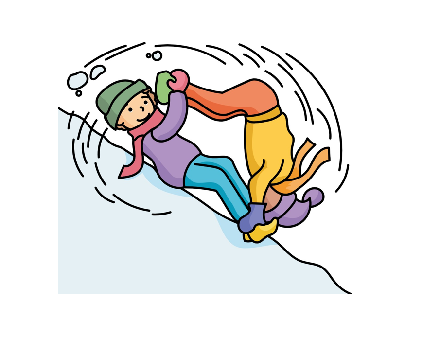 An einem leichten Hang legt sich einer in den Schnee - mit den Füssen hangabwärts (hier blau). Der andere (hier gelb) - er schaut hangabwärts - stellt sich so hin, dass der Kopf des Liegenden zwischen seinen Füssen ist. Der Liegende hebt seine Beine so hoch, dass der Stehende sie ergreifen und sich daran festhalten kann. Der Liegende hält sich nun seinerseits an den Füssen des Stehenden fest.