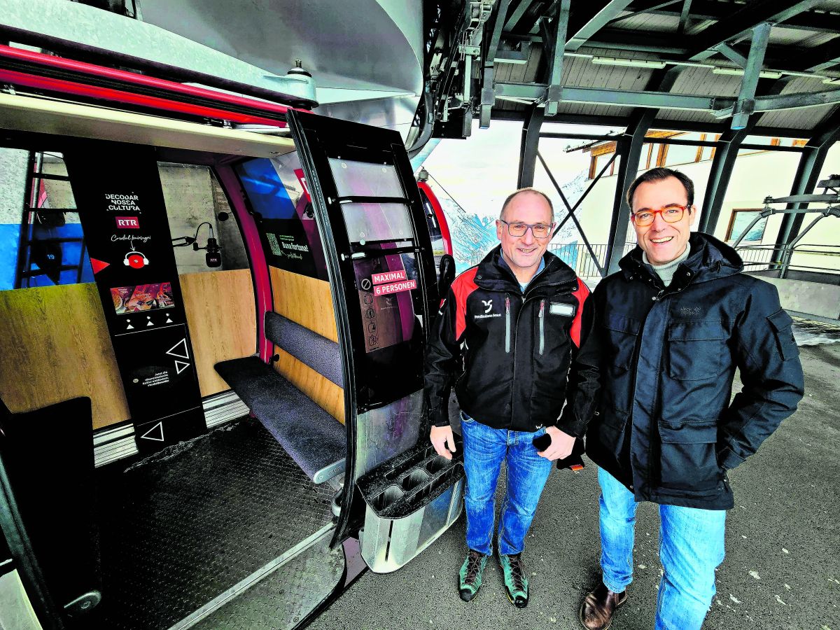 Il directer da las Pendicularas Scuol Andri Poo (a schnestra) ed il directer da RTR Nicolas Pernet preschaintan