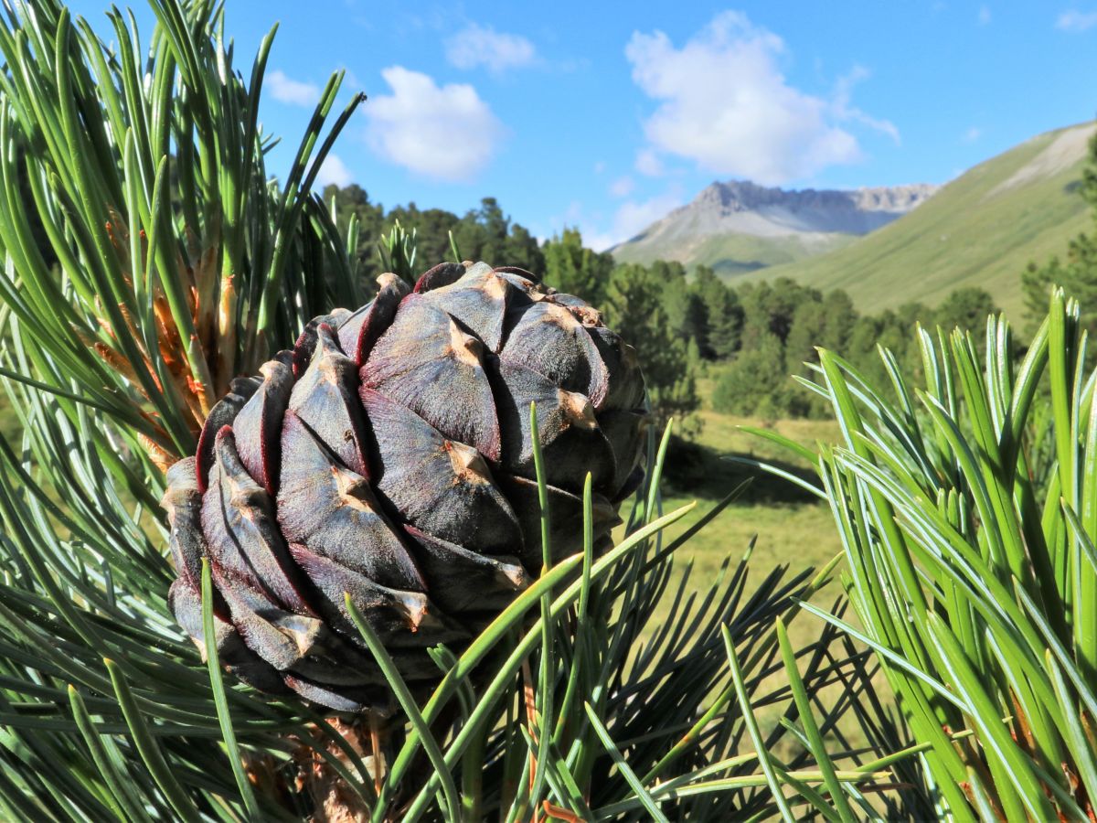 Arvenzapfen bilden sich aus den weiblichen Blüten. Sie sind nährstoffreich und bilden die Nahrungsgrundlage für den Tannenhäher. Foto Claudia Wartmann, Tamangur