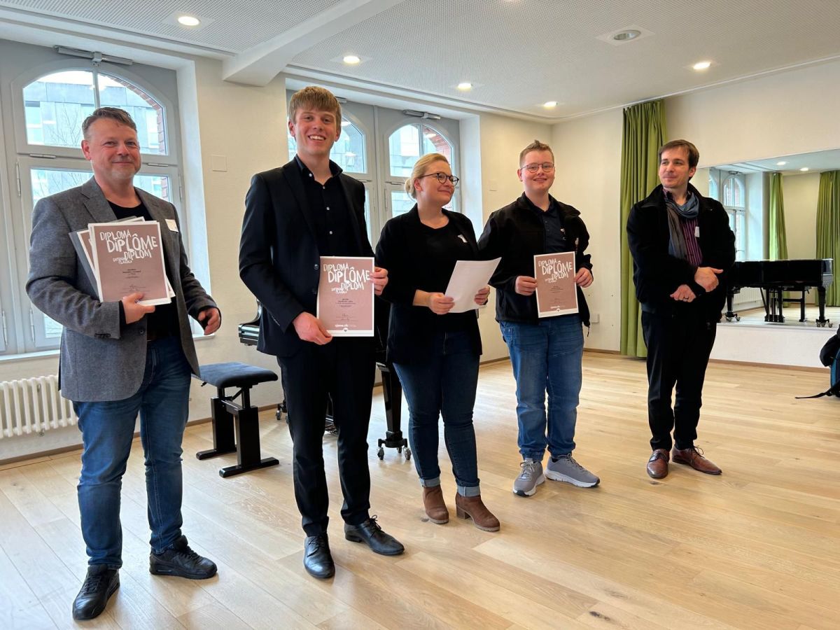 Janic Sendelhofer (2. von links) und Simon Gabriel (4. von links) mit den Juroren bei der Diplomübergabe.