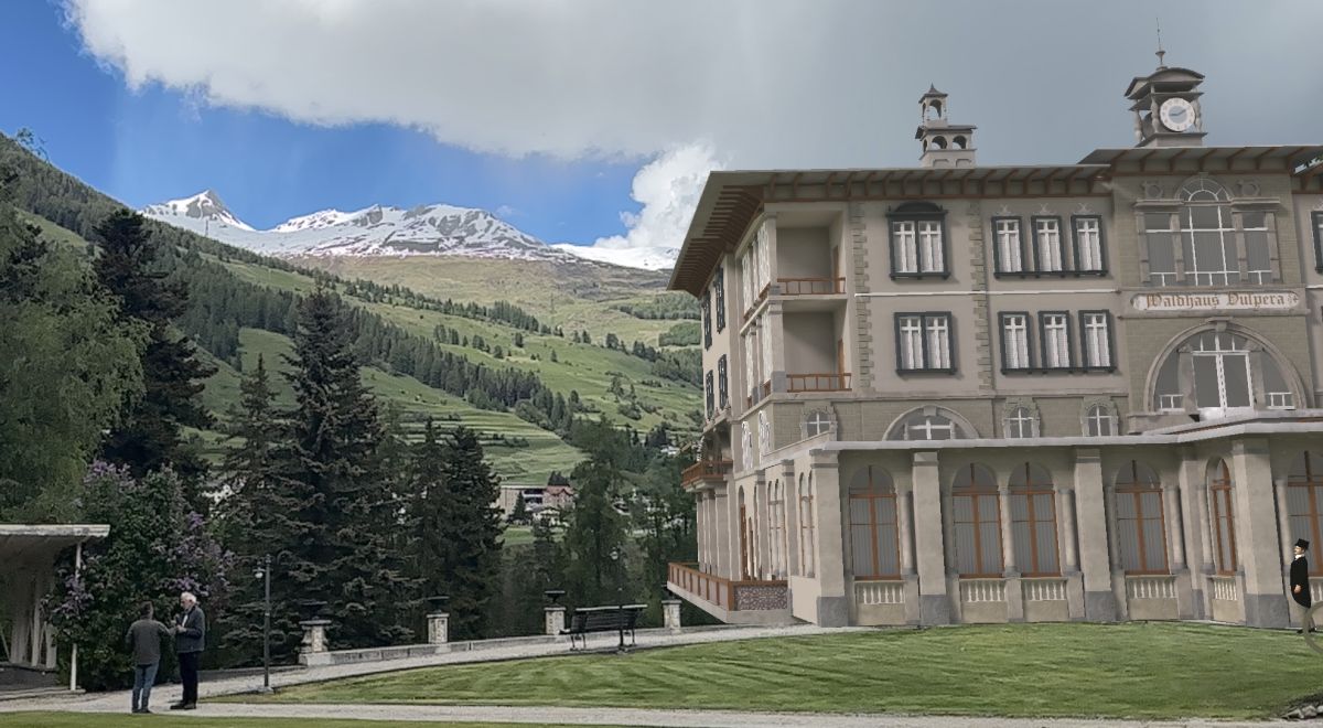 La app «Misteri a Vulpera» muossa culla camera dal telefonin ingio cha’l Grandhotel Waldhaus as rechattaiva (fotografia: Martin Camichel).