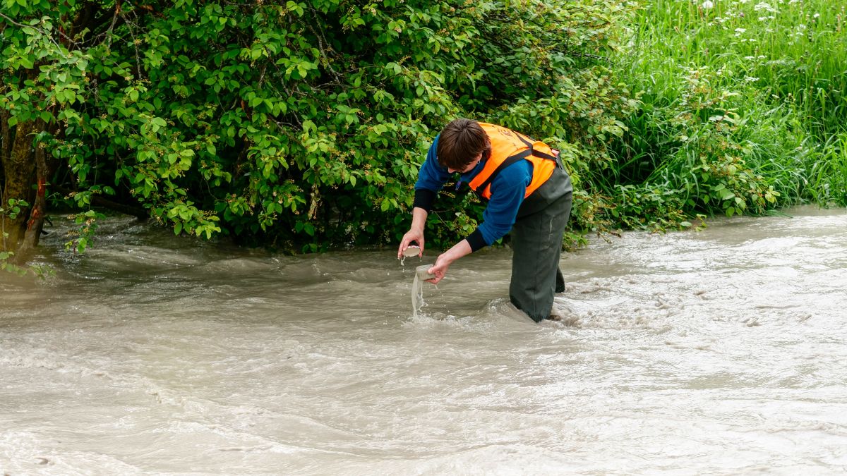 Sasha Löffler watet in Fischerstiefeln und kniehoch im trüben Spölbach ein paar Schritte vom Ufer weg. Dann schraubt sie den Deckel von einem kleinen Einmachglas, hält dieses ins Wasser, bis es voll ist, und verschliesst es. Vorsichtig steigt ...