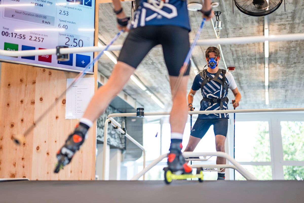 Ein wichtiges Teilgebiet der Sportmedizin stellt die Bewertung des Trainingserfolgs durch Leistungstests dar. Um sie in besonders realitätsnahen Bedingungen durchführen zu können, hat die Klinik Gut zusammen mit Engadin Nordic ein extragrosses Laufband angeschafft, auf dem auch mit Rollskis oder auf dem Rad trainiert werden kann. «Wir messen Puls, Laktat im Blut oder Sauerstoff und Kohlendioxyd in der Atemluft. Daraus erkennen wir, wie es um die Fitness der Athletinnen steht und in welcher Intensität sie trainieren sollen, um einen möglichst guten Effekt zu erreichen», sagt Alexander Delvendahl, Chefarzt Innere Medizin und Sportmediziner der Klinik Gut.
