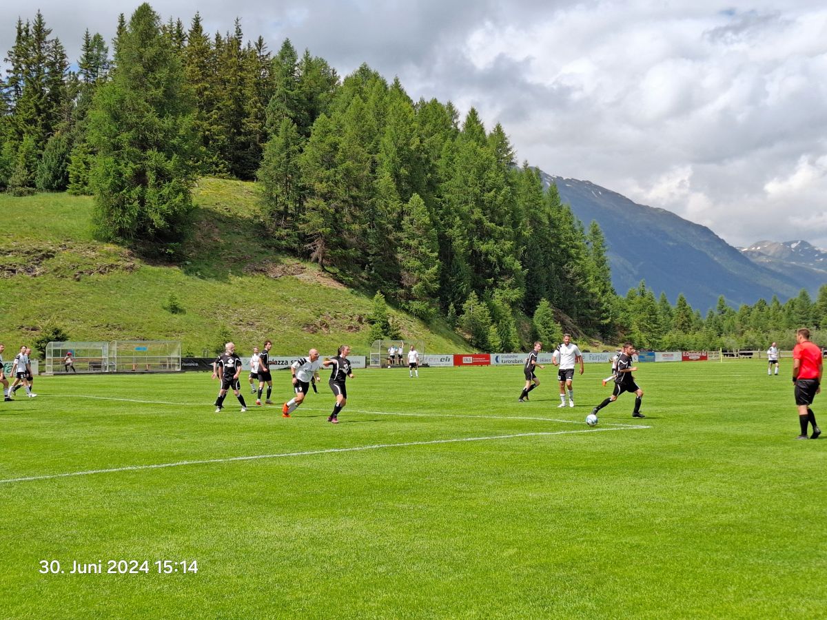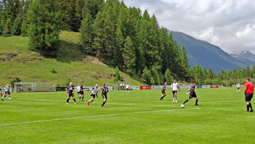 Voller Einsatz: Die «Pastors United» in schwarzen Trikots kämpfen auf dem Rasen gegen die Altherren des FC Celerina.