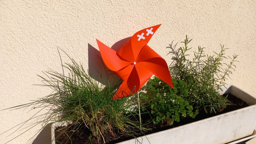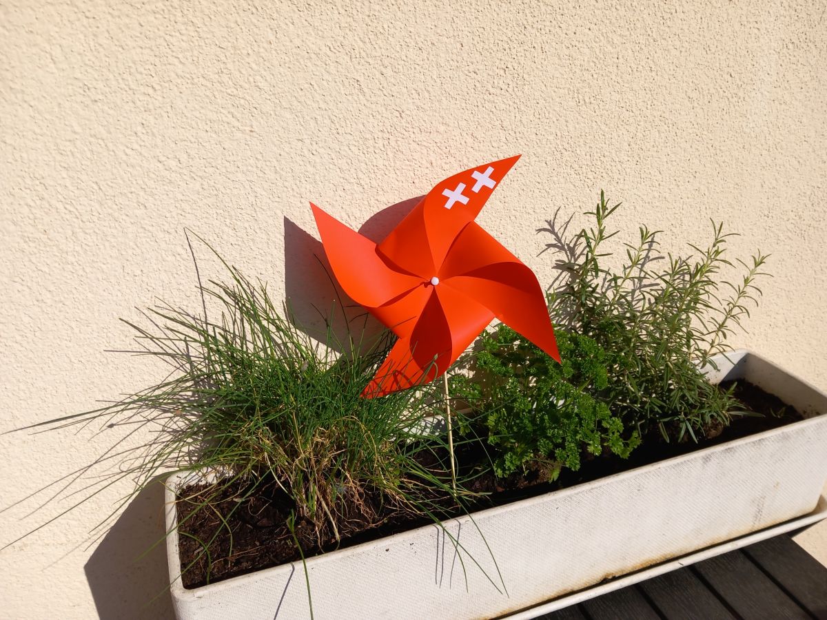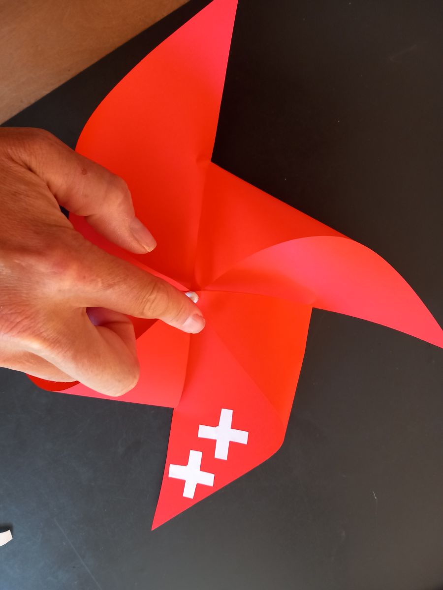 Falte nun jeweils eine Ecke zur Mitte hin, um zu sehen, wo das Windrad dekoriert werden kann. Schneide nun kleine Schweizerkreuze aus weissem Papier aus und klebe sie auf.