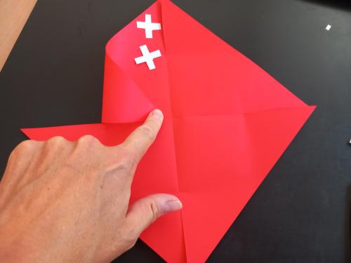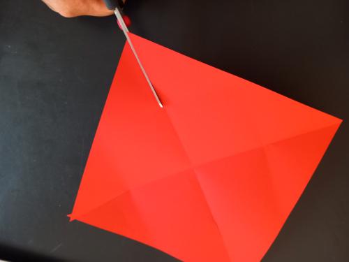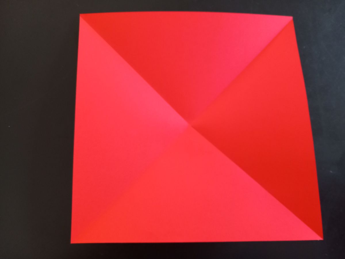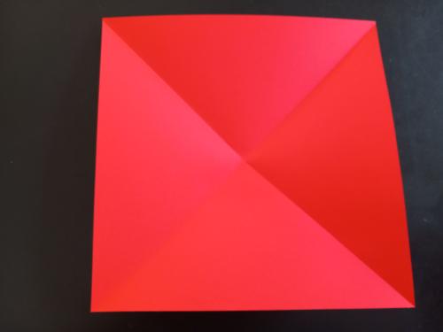 Nimm ein quadratisches, rotes Papier. Falte das Papier zweimal zu einem Dreieck, so dass die Faltlinien sich in der Mitte kreuzen.