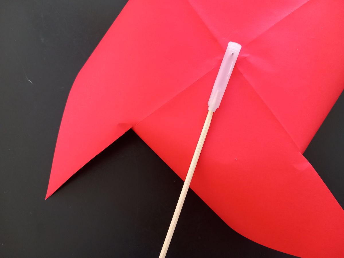 Fixiere die Ecken nun in der Mitte mit der Pinn-Nadel und stich diese ans untere Ende der Tintenpatrone, so dass das ganze Windrad daran fixiert ist.