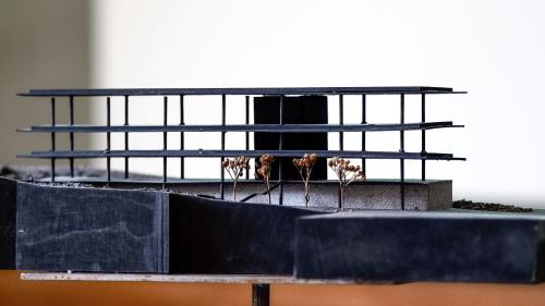 Das Siegerprojekt Spaniola des Churer Architekturbüros Giubbini Architekten mit dem geplanten Neubau der Jugendherberge in Turmform (rechts). Visualisierung: Giubbini Architekten ETH SIA