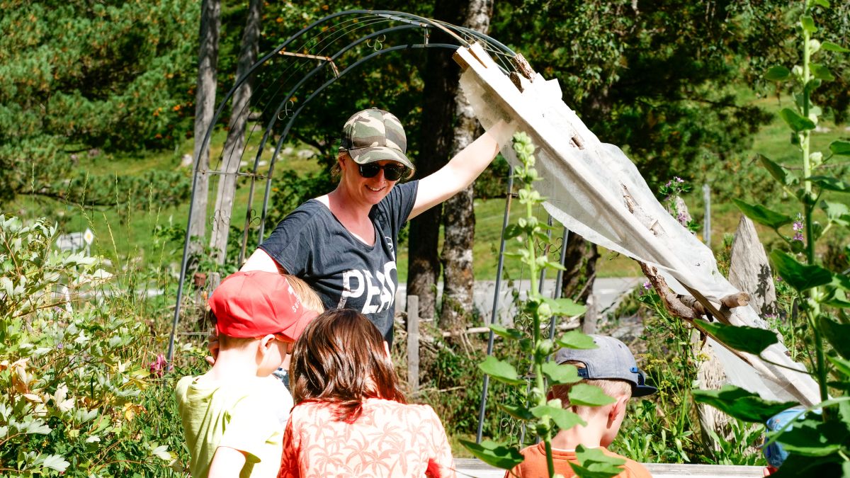 Julia Treiber mit den wissbegierigen Gartenkindern am Frühbeet am Ospiz Chapella. Fotos: Jon Duschletta