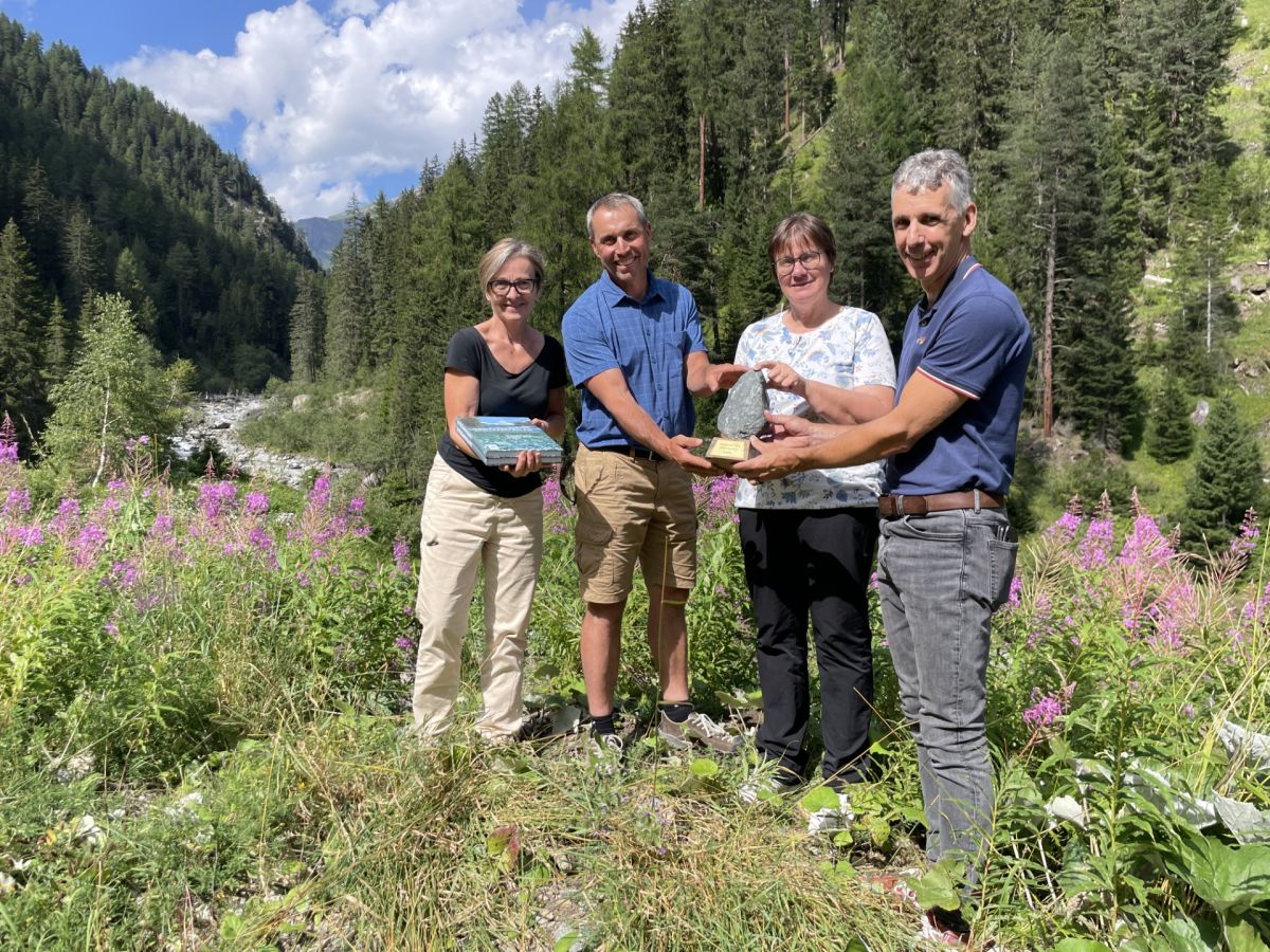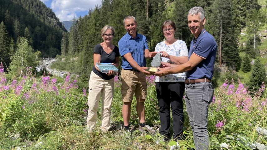 Feierliche Übergabe des Nominierungspokals mit Anita Mazzetta, Fadri Riatsch, Aita Zanetti und Fadri Guidon. Foto: Fadrina Hofmann