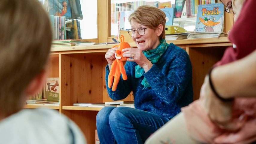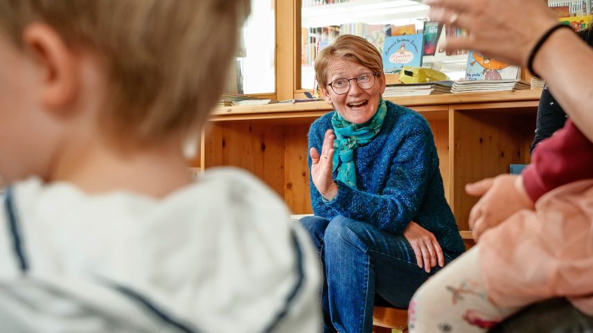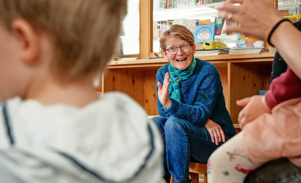 La pedagoga curativa Beatrice Müller Triebs accumpogna cun bler sang cour ad uffants i’l muond da cudeschs, gös e chanzuns.