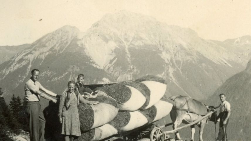 Il cudesch cuntegna eir fotografias chi derivan da l’archiv da la famiglia da l’autura Olga Prevost-Bazzell. Quia il bouv chi spetta da manar a chasa la chargia d’fain. fotografia: mad