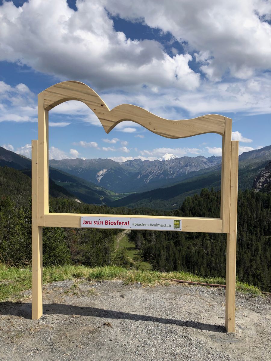 Dal 2021 vaiva il Parc da natüra Biosfera Val Müstair installà a Süsom Givè ün «selfie-point» cun sguard vers la val. Pel mumaint daja vistas particularas süllas elecziuns presidialas dal Cumün da Val Müstair (fotografia: David Truttmann).