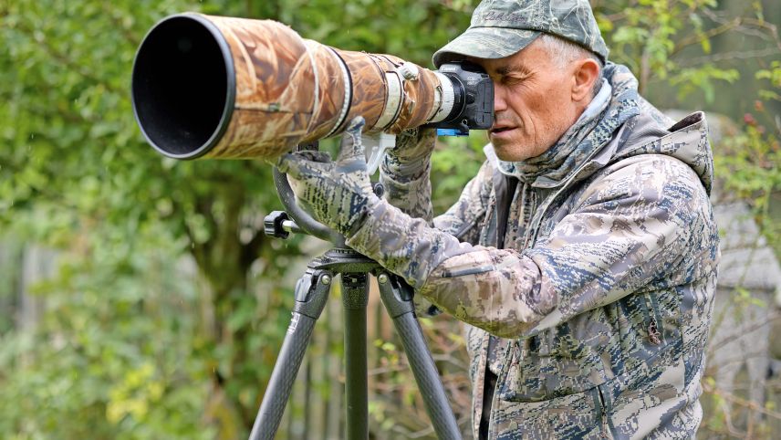 «Cur chi’d es i a fin culla chatscha n’haja cumanzà a fotografar»: Cesare Mauri in vesti da camufladi.