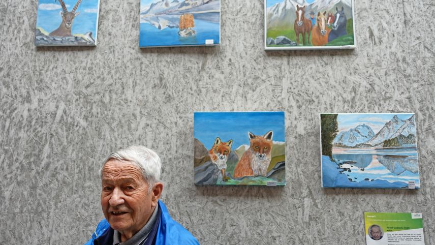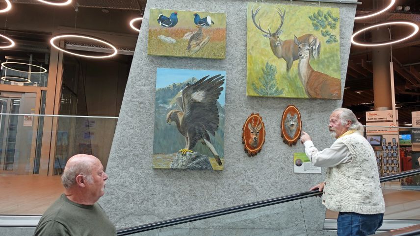 Künstlerinnen und Künstler kamen an der SenArt-Vernissage ins Gespräch: Peter Picenoni (links) und Toni Weishaupt fachsimpeln über die dreidimensionale Maltechnik des Wolfsportraits.