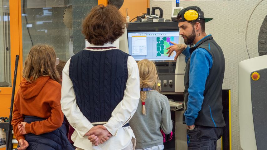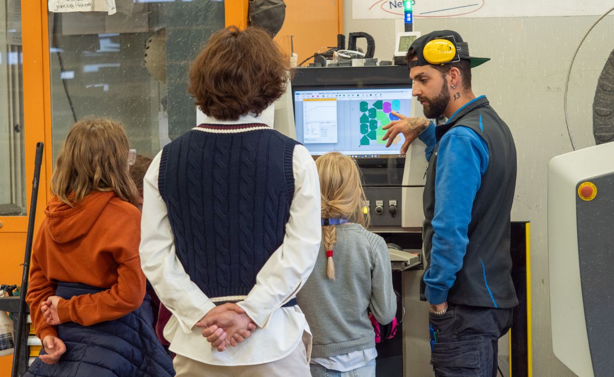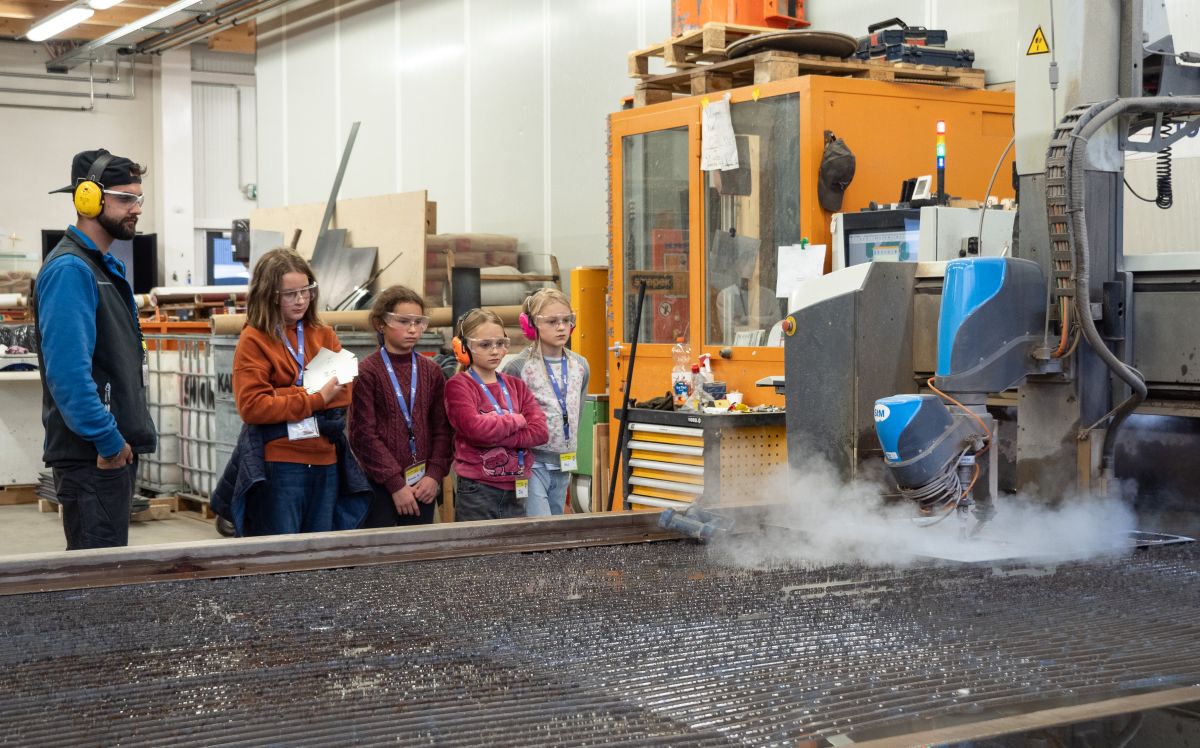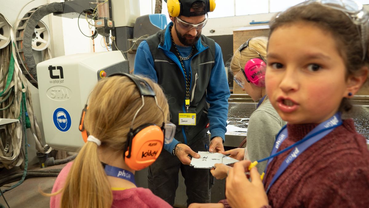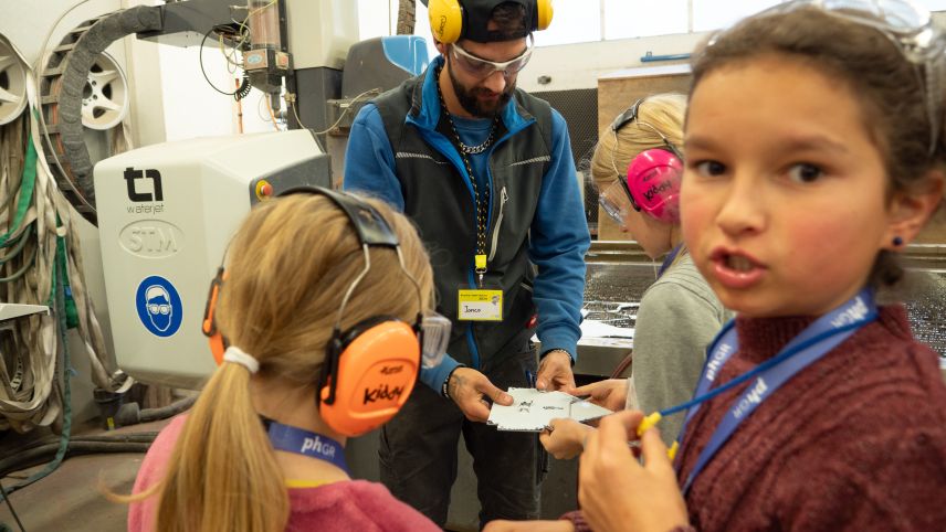 Jon-Corsin Neuhäusler (links) der Tschenett AG beobachtet mit MINT-Schülerinnen gespannt, wie ein Wasserstrahl die zuvor programmierten Dachteile ihres Vogelhäuschens aus einer Aluminiumplatte schneidet. Fotos: Jon Duschletta