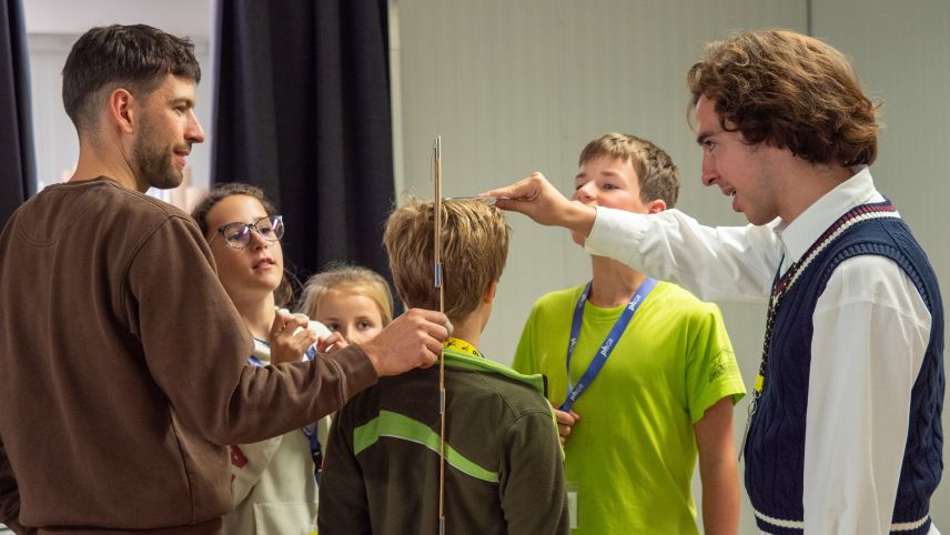 Gildo Hohenegger von der Schreinerei Pichalain SA in Fuldera (links) und PH-Student Marcel von Salis machen mit den Kindern eine Lockerungsübung bei der die Kinder ihre Grösse schätzen müssen. Danach wird gemeinsam nachgemessen.