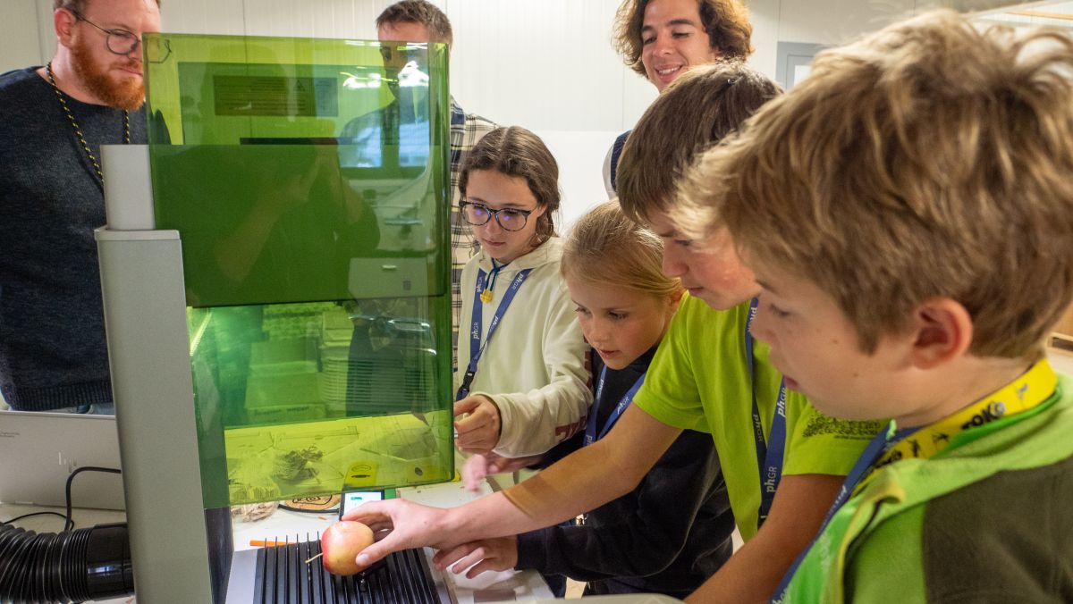 Cla Tschenett (links) von der Grafikfirma Aimara AG in Müstair hat den Kindern soeben gezeigt, wie die Schale eines Apfels mittels Lasertechnik beschriftet werden kann.